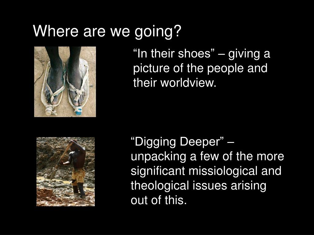 Where are we going? • “In their shoes” – giving a picture of the people and their worldview. • “Digging Deeper” – unpacking a few of the more significant missiological and theological issues arising out of this.