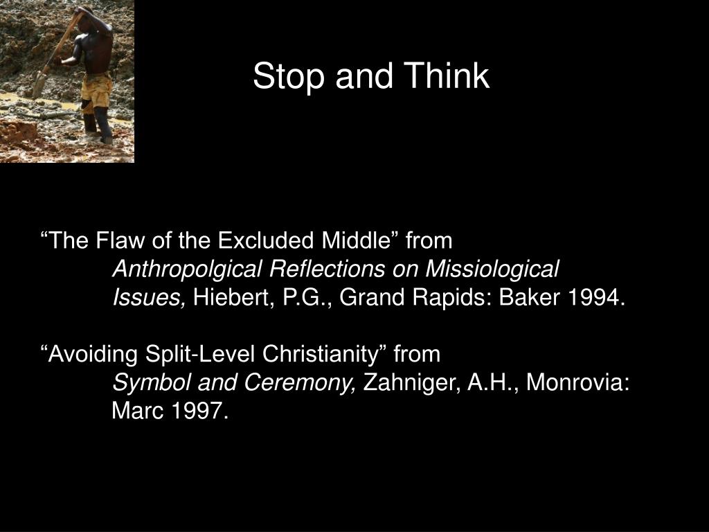 Stop and Think “The Flaw of the Excluded Middle” from Anthropolgical Reflections on Missiological Issues, Hiebert, P.G., Grand Rapids: Baker 1994. “Avoiding Split-Level Christianity” from Symbol and Ceremony, Zahniger, A.H., Monrovia: Marc 1997.