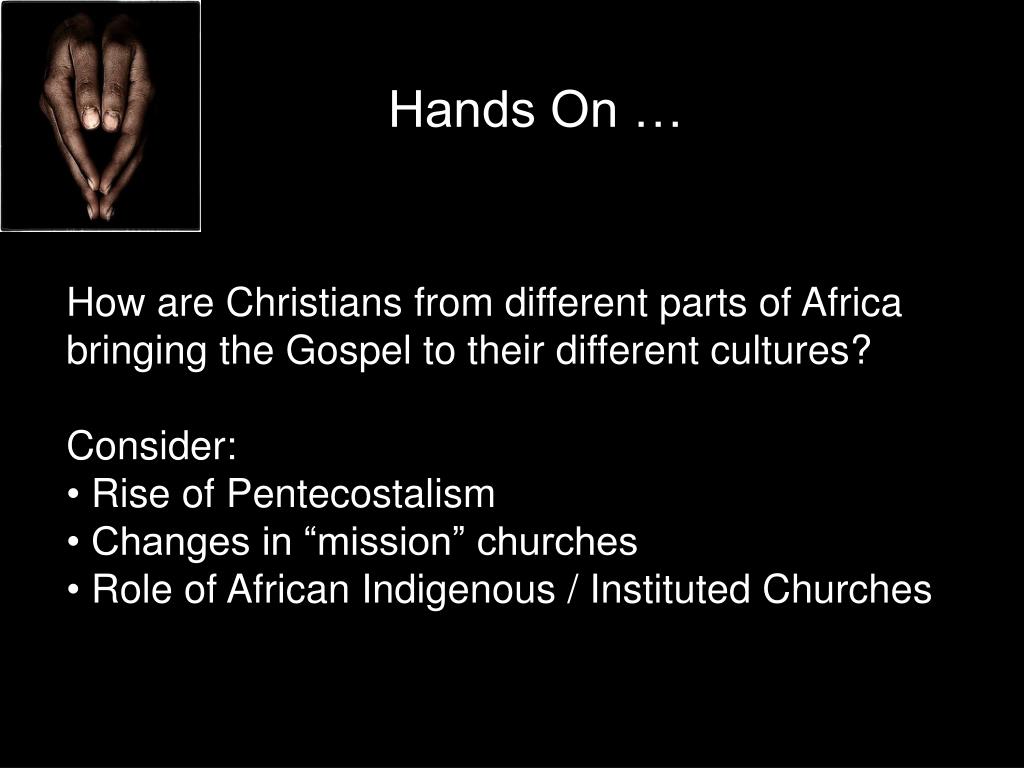 Hands On … • How are Christians from different parts of Africa bringing the Gospel to their different cultures? • Consider: • Rise of Pentecostalism • Changes in “mission” churches • Role of African Indigenous / Instituted Churches