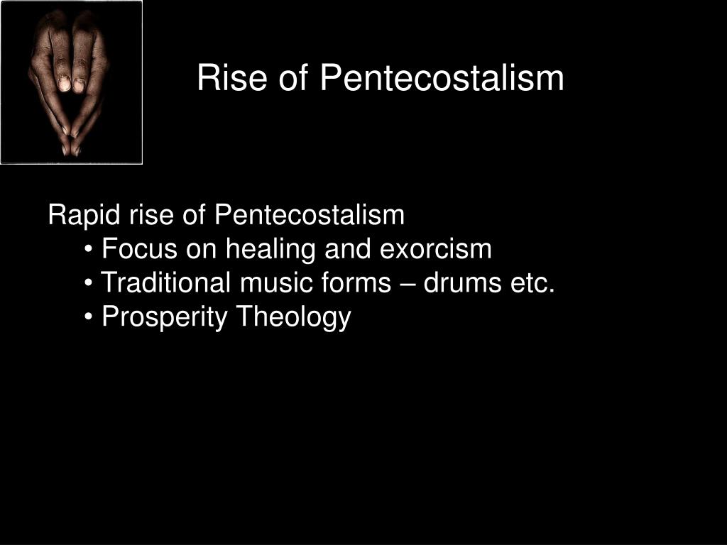 Rise of Pentecostalism • Rapid rise of Pentecostalism • Focus on healing and exorcism • Traditional music forms – drums etc. • Prosperity Theology