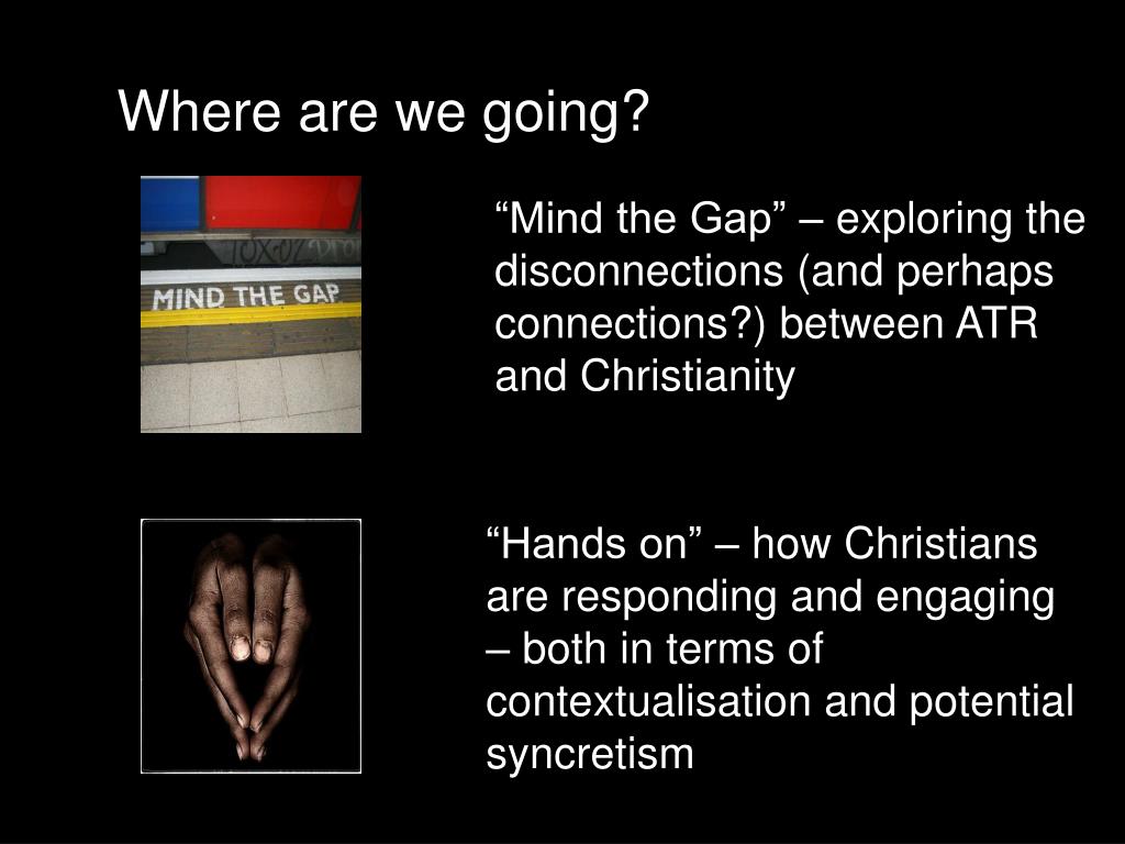 Where are we going? • “Mind the Gap” – exploring the disconnections (and perhaps connections?) between ATR and Christianity • “Hands on” – how Christians are responding and engaging – both in terms of contextualisation and potential syncretism