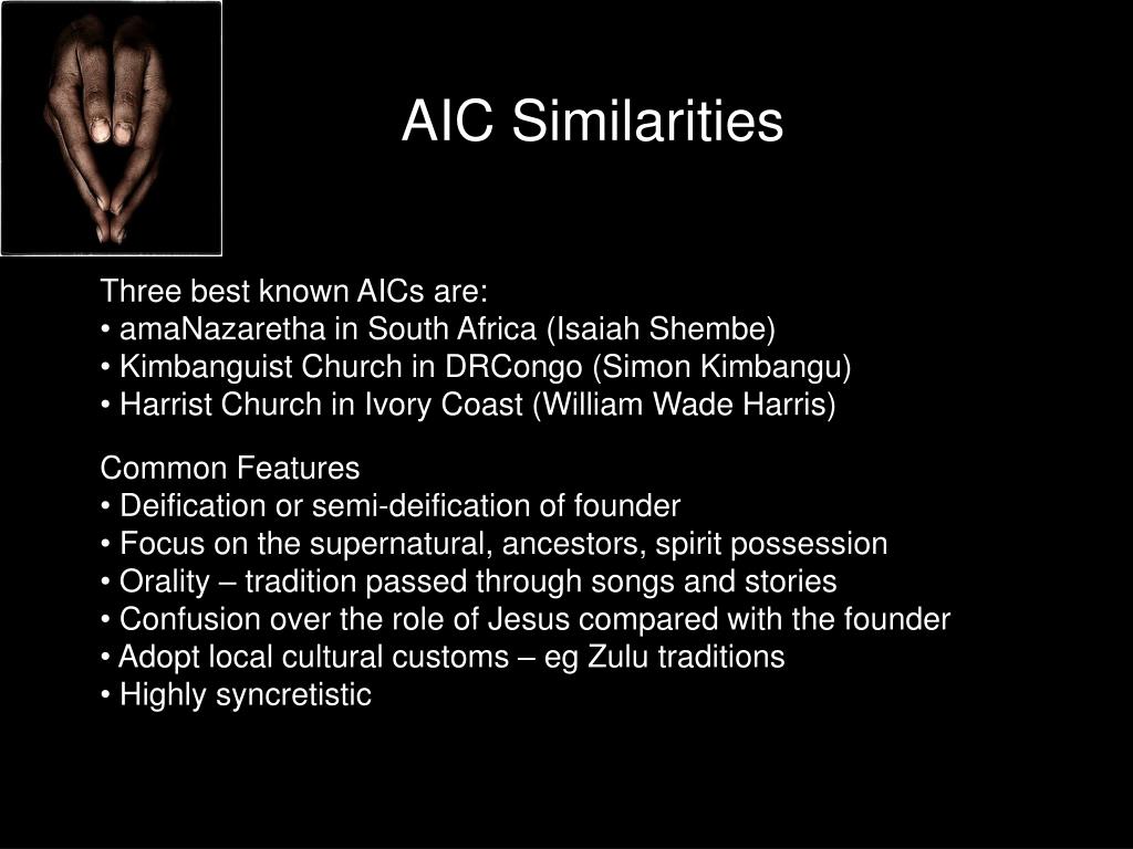 AIC Similarities • Three best known AICs are: • amaNazaretha in South Africa (Isaiah Shembe) • Kimbanguist Church in DRCongo (Simon Kimbangu) • Harrist Church in Ivory Coast (William Wade Harris) • Common Features • Deification or semi-deification of founder • Focus on the supernatural, ancestors, spirit possession • Orality – tradition passed through songs and stories • Confusion over the role of Jesus compared with the founder • Adopt local cultural customs – eg Zulu traditions • Highly syncretistic