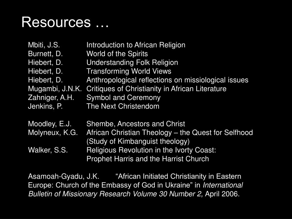 Resources … Mbiti, J.S. Introduction to African Religion Burnett, D. World of the Spirits Hiebert, D. Understanding Folk Religion Hiebert, D. Transforming World Views Hiebert, D. Anthropological reflections on missiological issues Mugambi, J.N.K. Critiques of Christianity in African Literature Zahniger, A.H. Symbol and Ceremony Jenkins, P. The Next Christendom Moodley, E.J. Shembe, Ancestors and Christ Molyneux, K.G. African Christian Theology – the Quest for Selfhood (Study of Kimbanguist theology) Walker, S.S. Religious Revolution in the Ivorty Coast: Prophet Harris and the Harrist Church Asamoah-Gyadu, J.K. “African Initiated Christianity in Eastern Europe: Church of the Embassy of God in Ukraine” in International Bulletin of Missionary Research Volume 30 Number 2, April 2006.