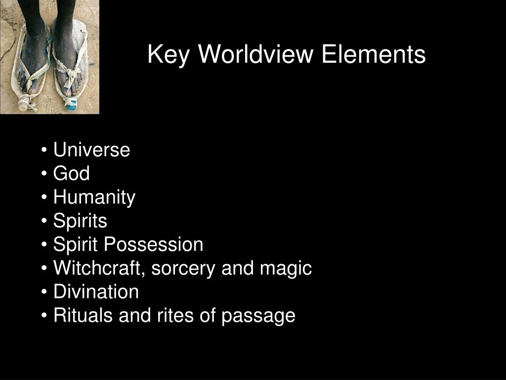 Key Worldview Elements • Universe • God • Humanity • Spirits • Spirit Possession • Witchcraft, sorcery and magic • Divination • Rituals and rites of passage