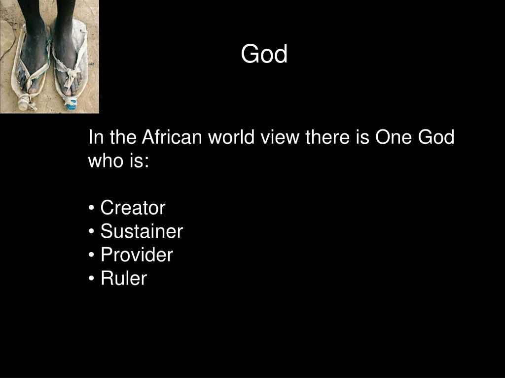 God • In the African world view there is One God who is: • Creator • Sustainer • Provider • Ruler