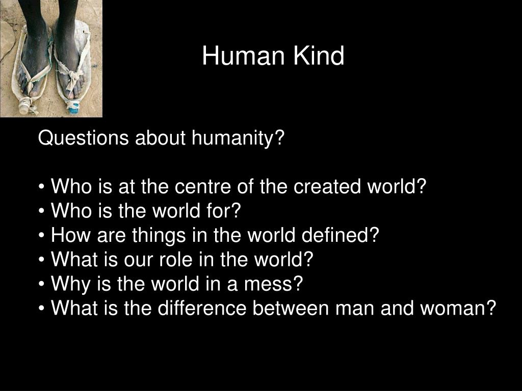 Human Kind • Questions about humanity? • Who is at the centre of the created world? • Who is the world for? • How are things in the world defined? • What is our role in the world? • Why is the world in a mess? • What is the difference between man and woman?