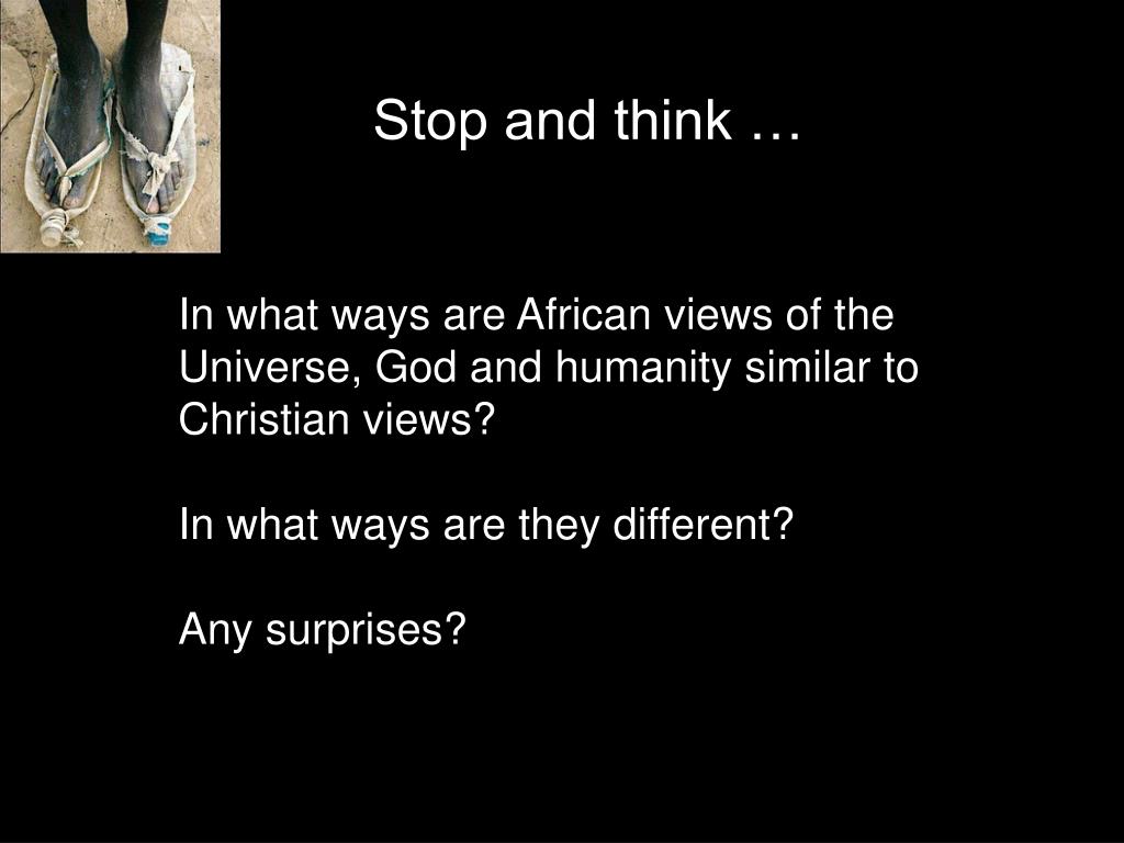 Stop and think … In what ways are African views of the Universe, God and humanity similar to Christian views? In what ways are they different? Any surprises?