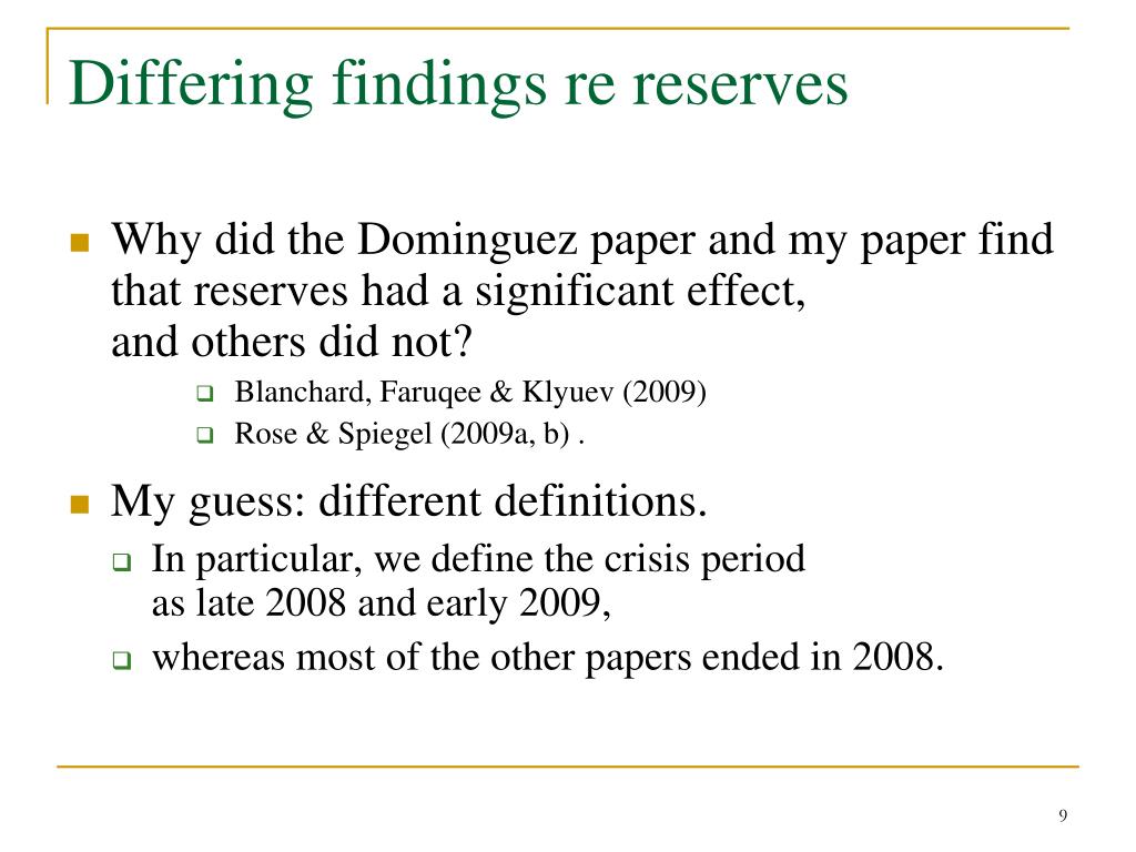 Differing findings re reserves • Why did the Dominguez paper and my paper find that reserves had a significant effect, and others did not? • Blanchard, Faruqee & Klyuev (2009) • Rose & Spiegel (2009a, b) . • My guess: different definitions. • In particular, we define the crisis period as late 2008 and early 2009, • whereas most of the other papers ended in 2008.