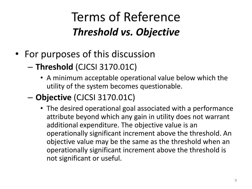 Terms of ReferenceThreshold vs. Objective • For purposes of this discussion • Threshold (CJCSI 3170.01C) • A minimum acceptable operational value below which the utility of the system becomes questionable. • Objective (CJCSI 3170.01C) • The desired operational goal associated with a performance attribute beyond which any gain in utility does not warrant additional expenditure. The objective value is an operationally significant increment above the threshold. An objective value may be the same as the threshold when an operationally significant increment above the threshold is not significant or useful.