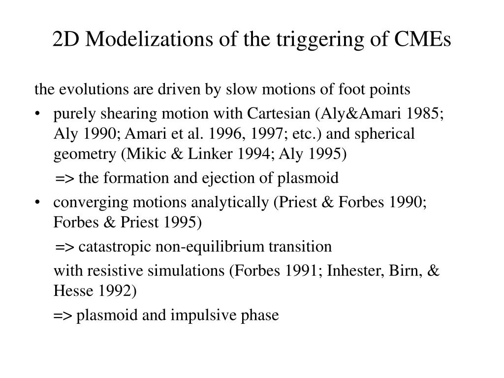 2D Modelizations of the triggering of CMEs the evolutions are driven by slow motions of foot points • purely shearing motion with Cartesian (Aly&Amari 1985; Aly 1990; Amari et al. 1996, 1997; etc.) and spherical geometry (Mikic & Linker 1994; Aly 1995) => the formation and ejection of plasmoid • converging motions analytically (Priest & Forbes 1990; Forbes & Priest 1995) => catastropic non-equilibrium transition with resistive simulations (Forbes 1991; Inhester, Birn, & Hesse 1992) => plasmoid and impulsive phase
