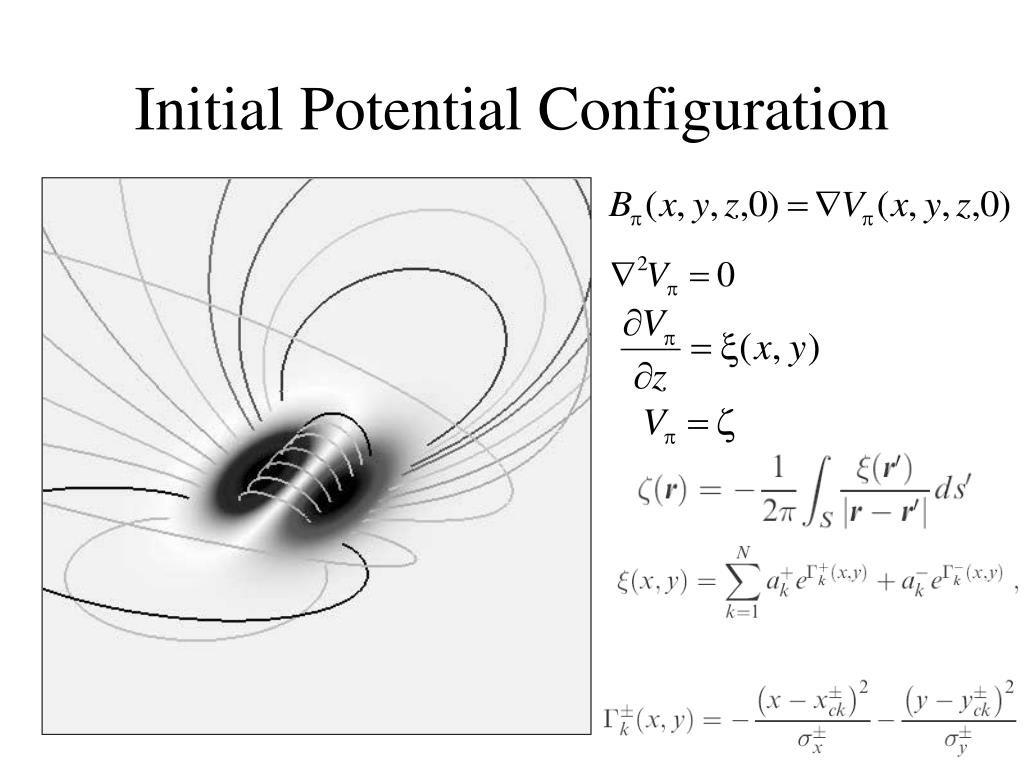 Conclusion They reported the results of numerical simulations • A series of initial stable force-free fields B0=B(t0) with |H(t0)|>0 are constructed by deforming a given potential field in two step process (twisting + relaxation) This evolution is almost quasi-static. • Imposing motions converging toward the inversion line, then quiet phase is stopped and configuration experiences a transition to a dynamic and strongly dissipative phase, during which reconnection leads to the formation of a twisted flux rope, however not in equilibrium.