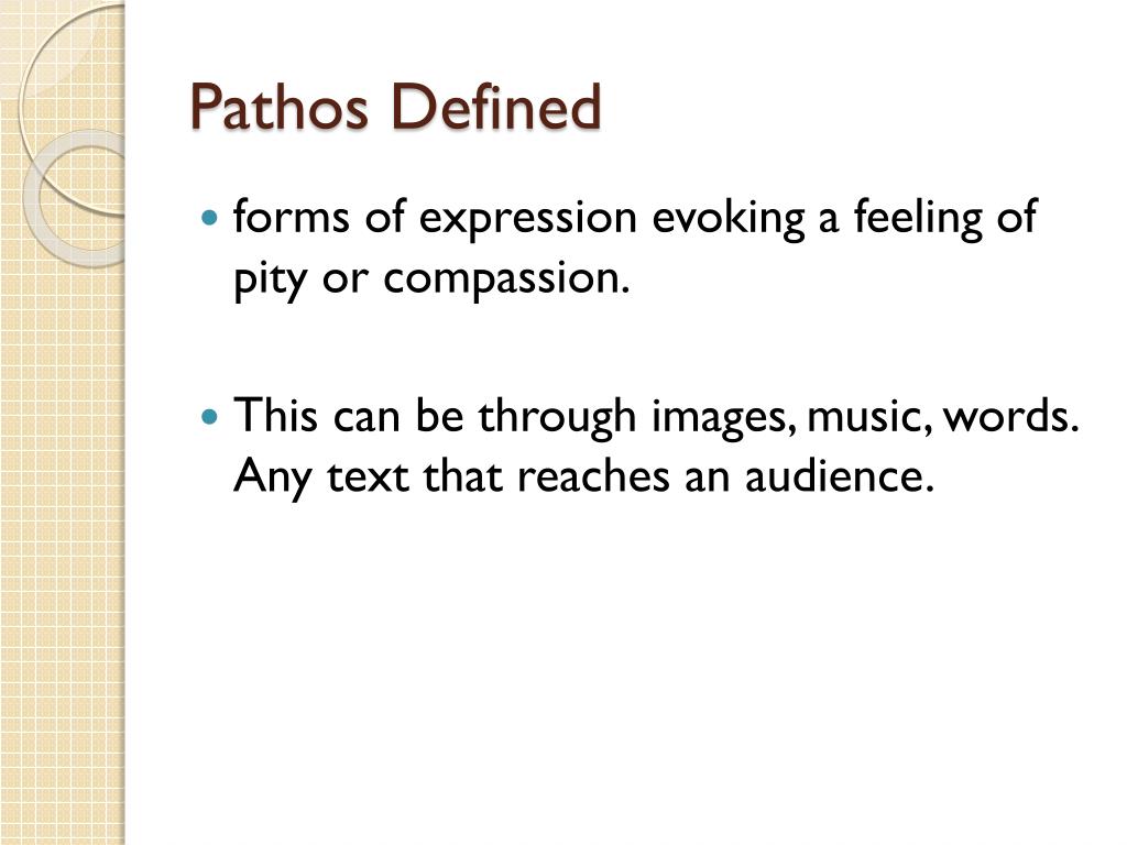 Pathos Defined • forms of expression evoking a feeling of pity or compassion. • This can be through images, music, words. Any text that reaches an audience.