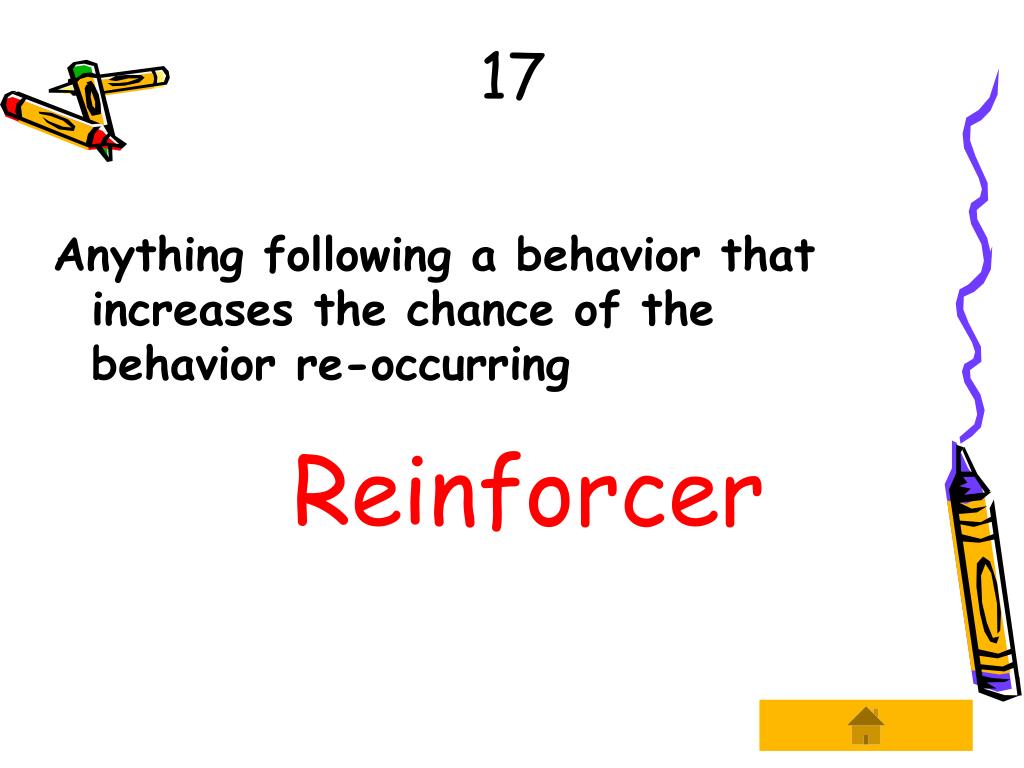 17 Anything following a behavior that increases the chance of the behavior re-occurring Reinforcer