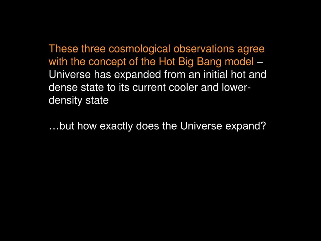 These three cosmological observations agree with the concept of the Hot Big Bang model – Universe has expanded from an initial hot and dense state to its current cooler and lower-density state …but how exactly does the Universe expand?