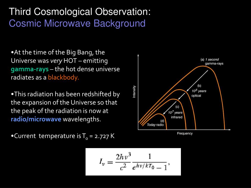 Third Cosmological Observation: Cosmic Microwave Background • At the time of the Big Bang, the Universe was very HOT – emitting gamma-rays – the hot dense universe radiates as a blackbody. • This radiation has been redshifted by the expansion of the Universe so that the peak of the radiation is now at radio/microwave wavelengths. • Current temperature is To = 2.727 K