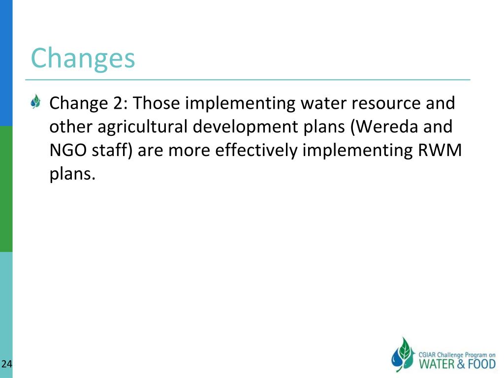 Changes • Change 2: Those implementing water resource and other agricultural development plans (Wereda and NGO staff) are more effectively implementing RWM plans.