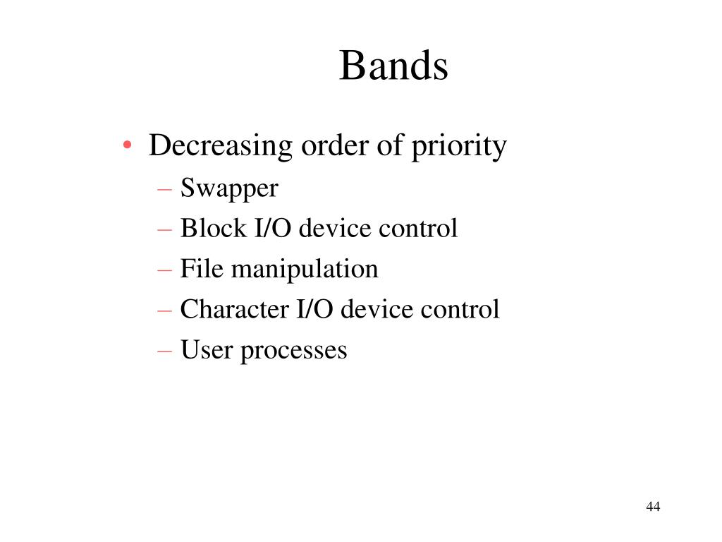 Bands • Decreasing order of priority • Swapper • Block I/O device control • File manipulation • Character I/O device control • User processes