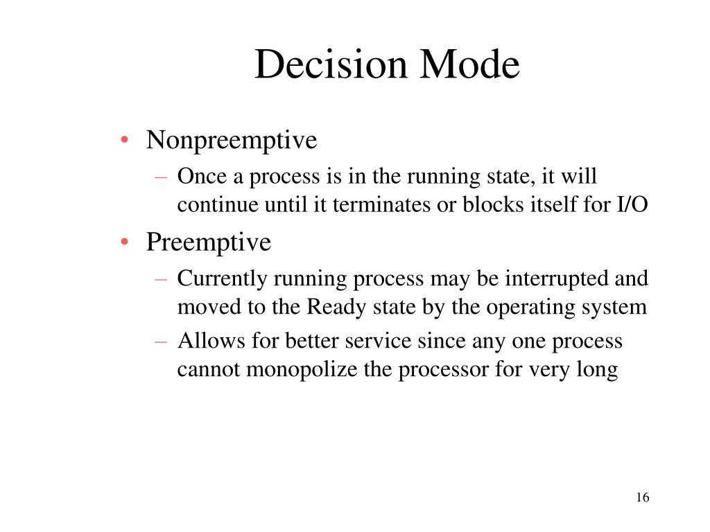 Decision Mode • Nonpreemptive • Once a process is in the running state, it will continue until it terminates or blocks itself for I/O • Preemptive • Currently running process may be interrupted and moved to the Ready state by the operating system • Allows for better service since any one process cannot monopolize the processor for very long