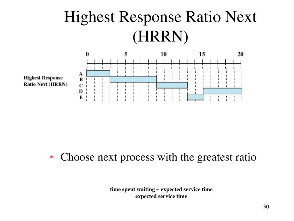 Highest Response Ratio Next (HRRN) • Choose next process with the greatest ratio time spent waiting + expected service time expected service time