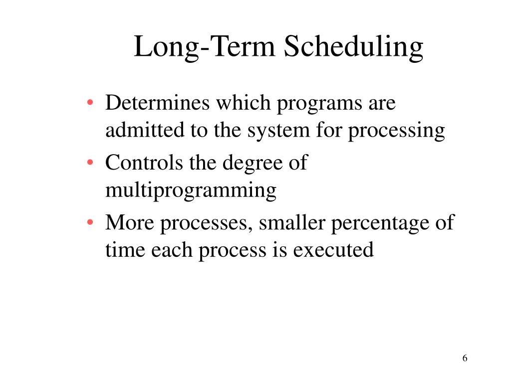 Long-Term Scheduling • Determines which programs are admitted to the system for processing • Controls the degree of multiprogramming • More processes, smaller percentage of time each process is executed