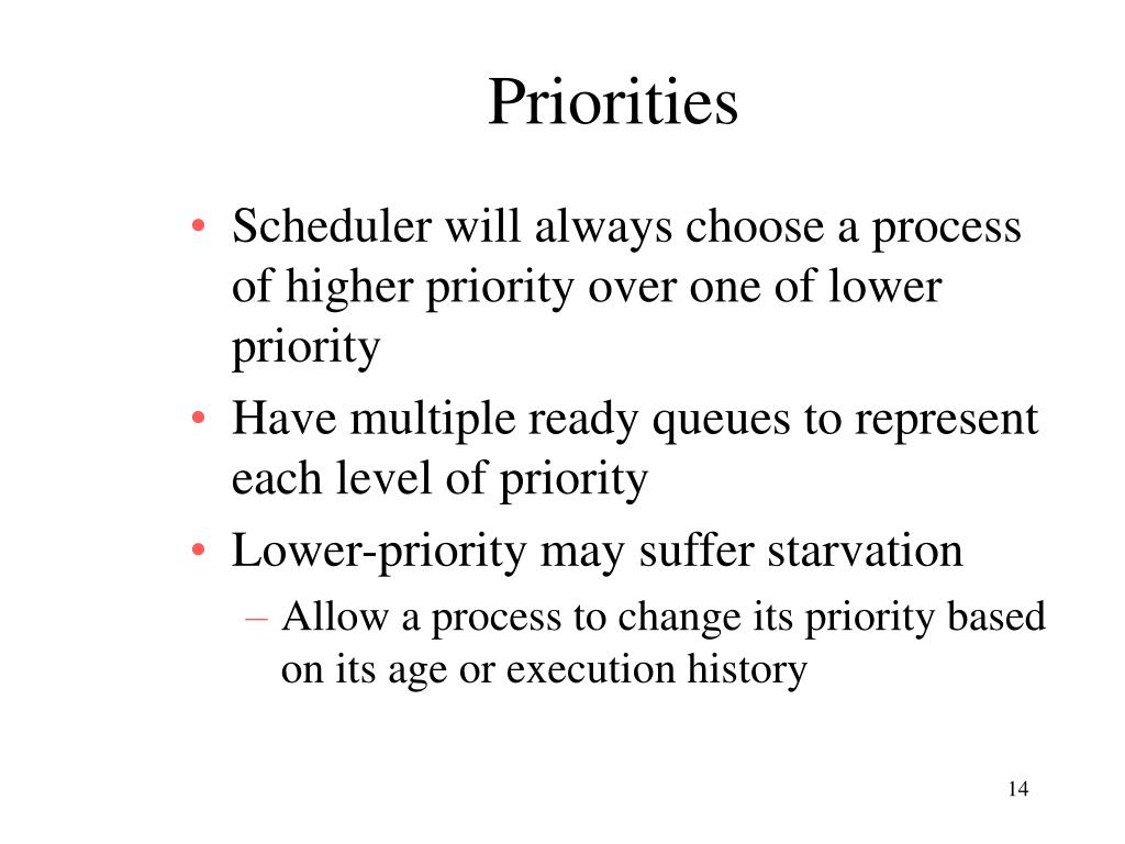 Priorities • Scheduler will always choose a process of higher priority over one of lower priority • Have multiple ready queues to represent each level of priority • Lower-priority may suffer starvation • Allow a process to change its priority based on its age or execution history