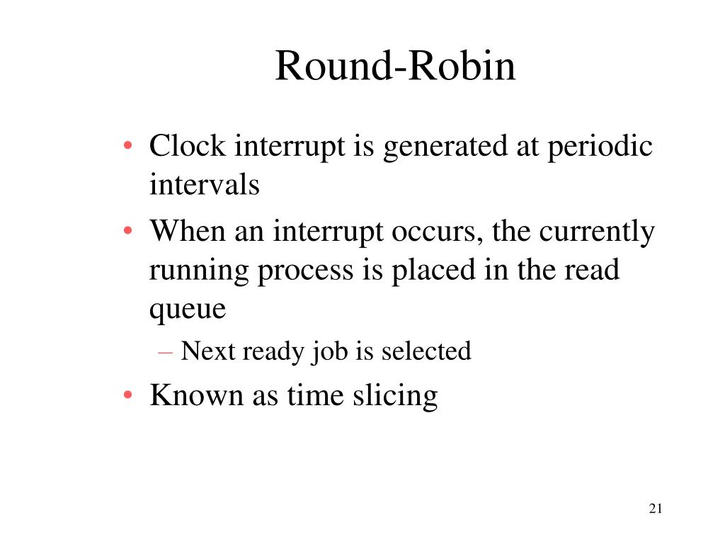 Round-Robin • Clock interrupt is generated at periodic intervals • When an interrupt occurs, the currently running process is placed in the read queue • Next ready job is selected • Known as time slicing