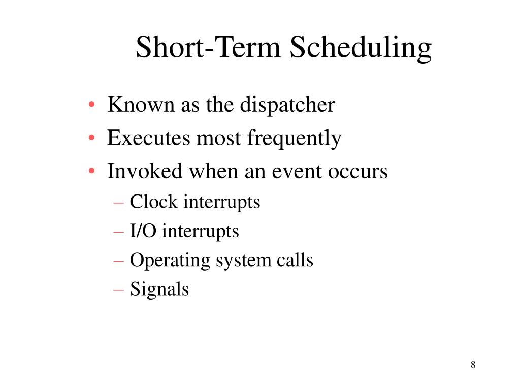Short-Term Scheduling • Known as the dispatcher • Executes most frequently • Invoked when an event occurs • Clock interrupts • I/O interrupts • Operating system calls • Signals