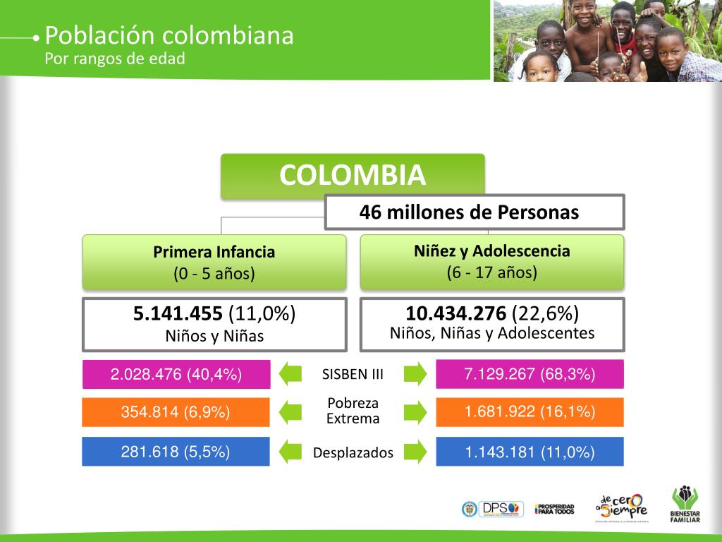Población colombiana Por rangos de edad COLOMBIA 46 millones de Personas Primera Infancia (0 - 5 años) Niñez y Adolescencia (6 - 17 años) 5.141.455 (11,0%) Niños y Niñas 10.434.276 (22,6%) Niños, Niñas y Adolescentes SISBEN III 7.129.267 (68,3%) 2.028.476 (40,4%) Pobreza Extrema 1.681.922 (16,1%) 354.814 (6,9%) Desplazados 281.618 (5,5%) 1.143.181 (11,0%)