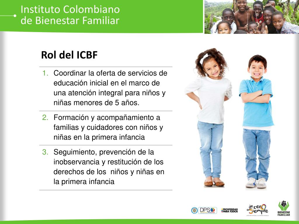 Instituto Colombianode Bienestar Familiar Rol del ICBF Coordinar la oferta de servicios de educación inicial en el marco de una atención integral para niños y niñas menores de 5 años. Formación y acompañamiento a familias y cuidadores con niños y niñas en la primera infancia Seguimiento, prevención de la inobservancia y restitución de los derechos de los niños y niñas en la primera infancia
