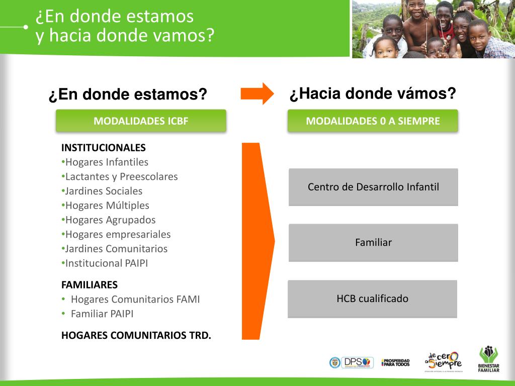 ¿En donde estamos y hacia donde vamos? ¿Hacia donde vámos? ¿En donde estamos? MODALIDADES ICBF MODALIDADES 0 A SIEMPRE • INSTITUCIONALES • Hogares Infantiles • Lactantes y Preescolares • Jardines Sociales • Hogares Múltiples • Hogares Agrupados • Hogares empresariales • Jardines Comunitarios • Institucional PAIPI Centro de Desarrollo Infantil Familiar • FAMILIARES • Hogares Comunitarios FAMI • Familiar PAIPI HCB cualificado HOGARES COMUNITARIOS TRD.