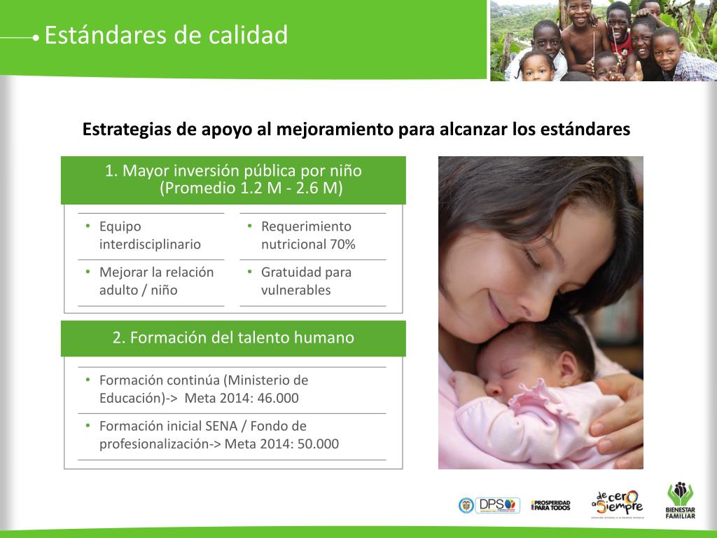 Estándares de calidad Estrategias de apoyo al mejoramiento para alcanzar los estándares 1. Mayor inversión pública por niño (Promedio 1.2 M - 2.6 M) • Equipo interdisciplinario • Mejorar la relación adulto / niño • Requerimiento nutricional 70% • Gratuidad para vulnerables 2. Formación del talento humano • Formación continúa (Ministerio de Educación)-> Meta 2014: 46.000 • Formación inicial SENA / Fondo de profesionalización-> Meta 2014: 50.000