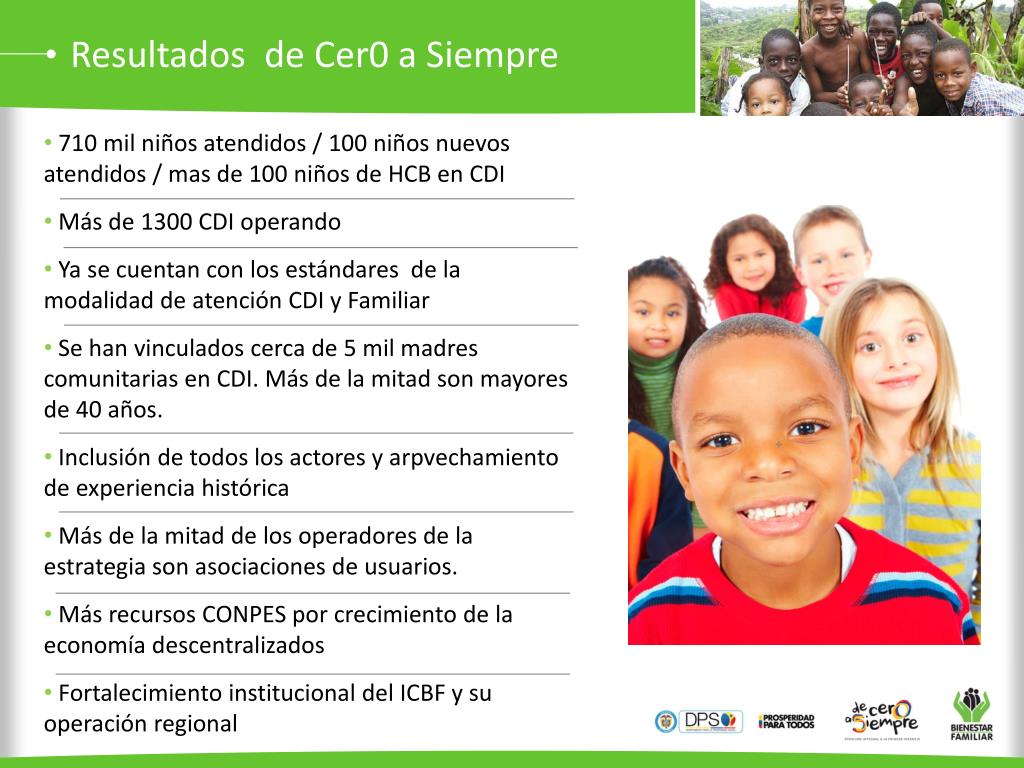 Resultados de Cer0 a Siempre • 710 mil niños atendidos / 100 niños nuevos atendidos / mas de 100 niños de HCB en CDI • Más de 1300 CDI operando • Ya se cuentan con los estándares de la modalidad de atención CDI y Familiar • Se han vinculados cerca de 5 mil madres comunitarias en CDI. Más de la mitad son mayores de 40 años. • Inclusión de todos los actores y arpvechamiento de experiencia histórica • Más de la mitad de los operadores de la estrategia son asociaciones de usuarios. • Más recursos CONPES por crecimiento de la economía descentralizados • Fortalecimiento institucional del ICBF y su operación regional