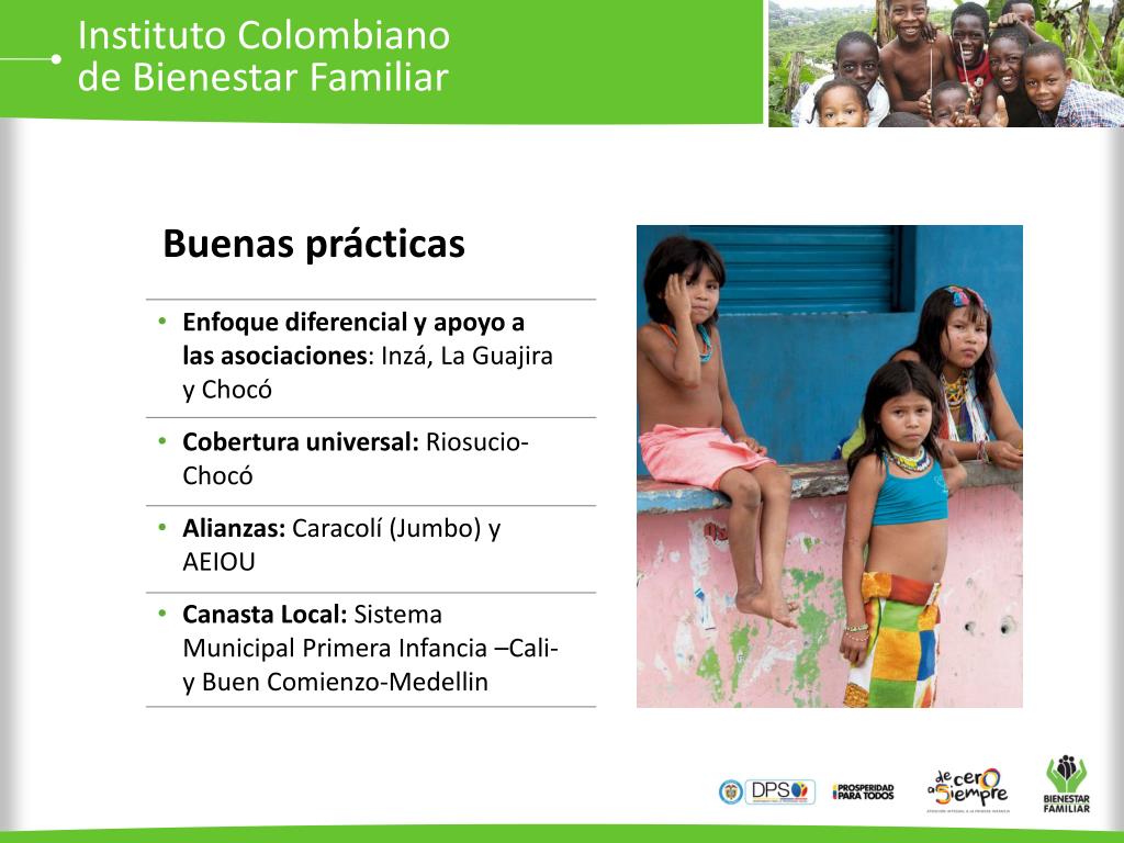 Instituto Colombianode Bienestar Familiar Buenas prácticas • Enfoque diferencial y apoyo a las asociaciones: Inzá, La Guajira y Chocó • Cobertura universal: Riosucio-Chocó • Alianzas: Caracolí (Jumbo) y AEIOU • Canasta Local: Sistema Municipal Primera Infancia –Cali- y Buen Comienzo-Medellin