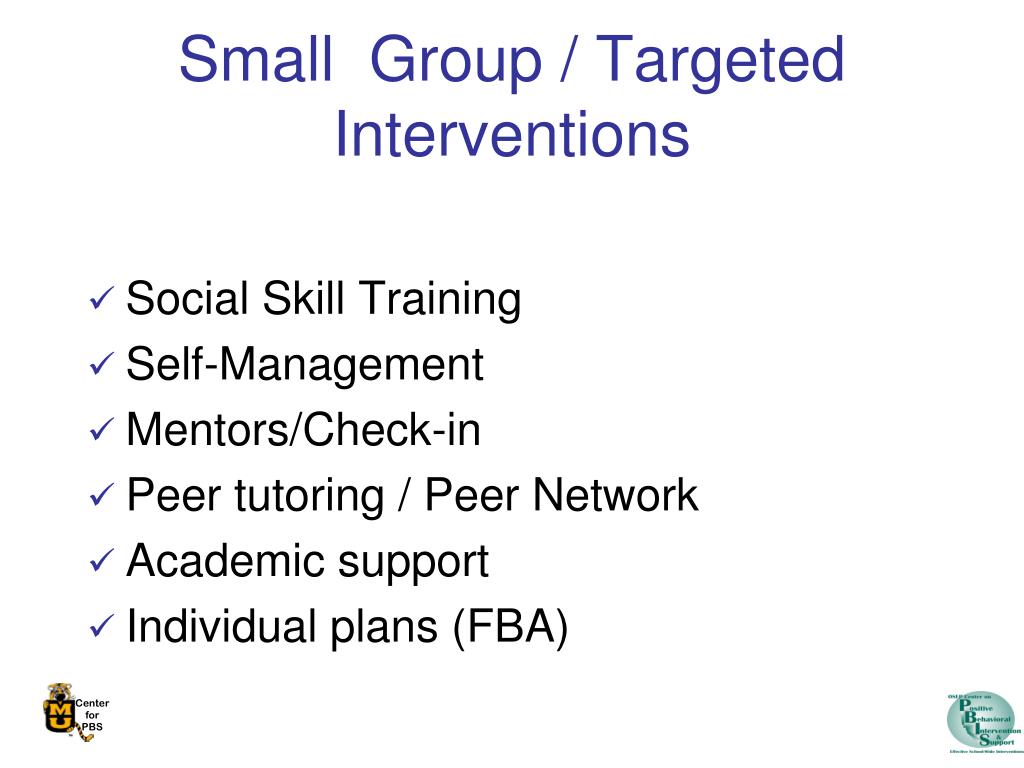 Small Group / Targeted Interventions Social Skill Training Self-Management Mentors/Check-in Peer tutoring / Peer Network Academic support Individual plans (FBA)
