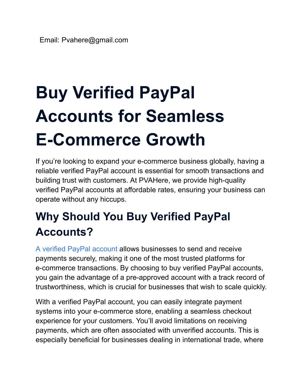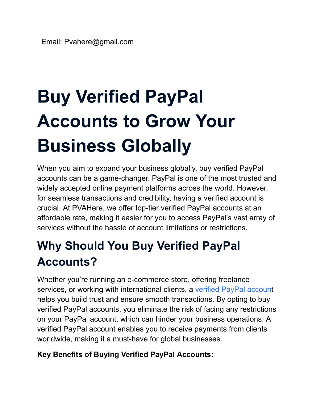 Email: Pvahere@gmail.com Buy Verified PayPal Accounts for Seamless E-Commerce Growth If you’re looking to expand your e-commerce business globally, having a reliable verified PayPal account is essential for smooth transactions and building trust with customers. At PVAHere, we provide high-quality verified PayPal accounts at affordable rates, ensuring your business can operate without any hiccups. Why Should You Buy Verified PayPal Accounts? A verified PayPal account allows businesses to send and receive payments securely, making it one of the most trusted platforms for e-commerce transactions. By choosing to buy verified PayPal accounts, you gain the advantage of a pre-approved account with a track record of trustworthiness, which is crucial for businesses that wish to scale quickly. With a verified PayPal account, you can easily integrate payment systems into your e-commerce store, enabling a seamless checkout experience for your customers. You’ll avoid limitations on receiving payments, which are often associated with unverified accounts. This is especially beneficial for businesses dealing in international trade, where