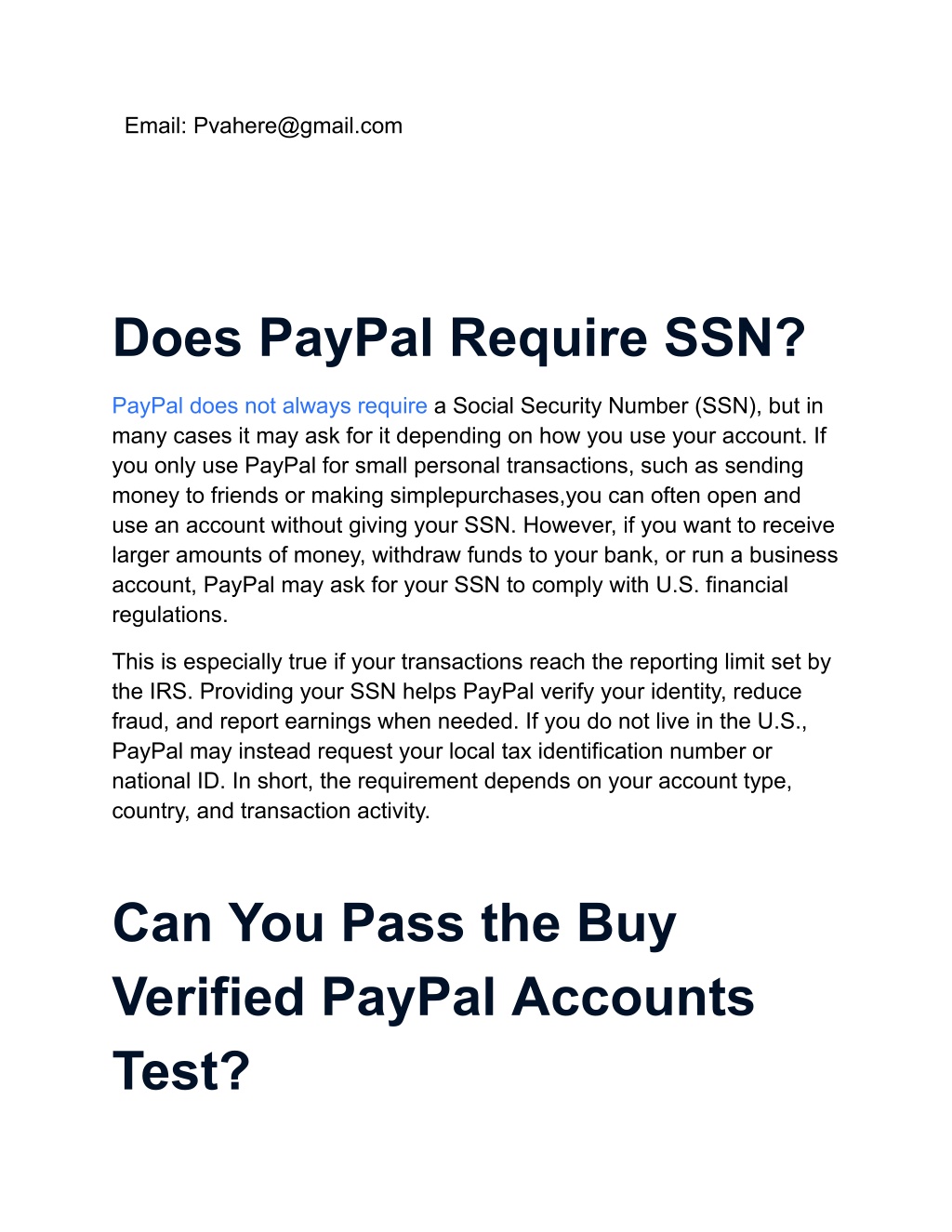 Email: Pvahere@gmail.com Does PayPal Require SSN? PayPal does not always require a Social Security Number (SSN), but in many cases it may ask for it depending on how you use your account. If you only use PayPal for small personal transactions, such as sending money to friends or making simplepurchases,you can often open and use an account without giving your SSN. However, if you want to receive larger amounts of money, withdraw funds to your bank, or run a business account, PayPal may ask for your SSN to comply with U.S. financial regulations. This is especially true if your transactions reach the reporting limit set by the IRS. Providing your SSN helps PayPal verify your identity, reduce fraud, and report earnings when needed. If you do not live in the U.S., PayPal may instead request your local tax identification number or national ID. In short, the requirement depends on your account type, country, and transaction activity. Can You Pass the Buy Verified PayPal Accounts Test?