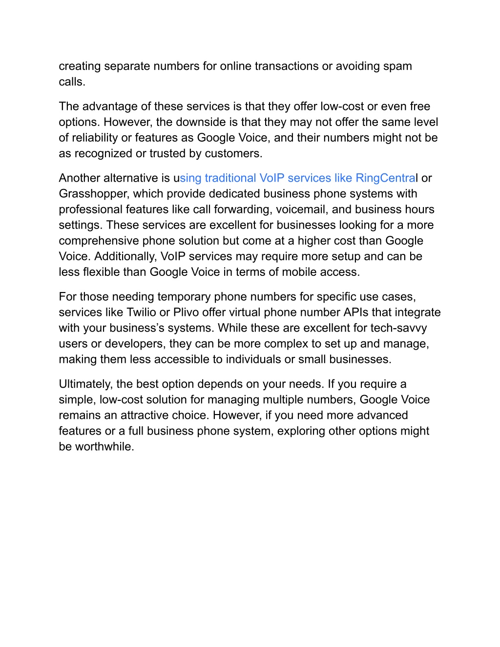 creating separate numbers for online transactions or avoiding spam calls. The advantage of these services is that they offer low-cost or even free options. However, the downside is that they may not offer the same level of reliability or features as Google Voice, and their numbers might not be as recognized or trusted by customers. Another alternative is using traditional VoIP services like RingCentral or Grasshopper, which provide dedicated business phone systems with professional features like call forwarding, voicemail, and business hours settings. These services are excellent for businesses looking for a more comprehensive phone solution but come at a higher cost than Google Voice. Additionally, VoIP services may require more setup and can be less flexible than Google Voice in terms of mobile access. For those needing temporary phone numbers for specific use cases, services like Twilio or Plivo offer virtual phone number APIs that integrate with your business’s systems. While these are excellent for tech-savvy users or developers, they can be more complex to set up and manage, making them less accessible to individuals or small businesses. Ultimately, the best option depends on your needs. If you require a simple, low-cost solution for managing multiple numbers, Google Voice remains an attractive choice. However, if you need more advanced features or a full business phone system, exploring other options might be worthwhile.