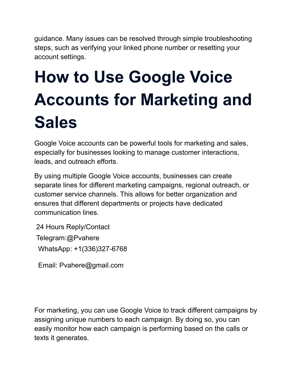 guidance. Many issues can be resolved through simple troubleshooting steps, such as verifying your linked phone number or resetting your account settings. How to Use Google Voice Accounts for Marketing and Sales Google Voice accounts can be powerful tools for marketing and sales, especially for businesses looking to manage customer interactions, leads, and outreach efforts. By using multiple Google Voice accounts, businesses can create separate lines for different marketing campaigns, regional outreach, or customer service channels. This allows for better organization and ensures that different departments or projects have dedicated communication lines. 24 Hours Reply/Contact Telegram:@Pvahere WhatsApp: +1(336)327-6768 Email: Pvahere@gmail.com For marketing, you can use Google Voice to track different campaigns by assigning unique numbers to each campaign. By doing so, you can easily monitor how each campaign is performing based on the calls or texts it generates.