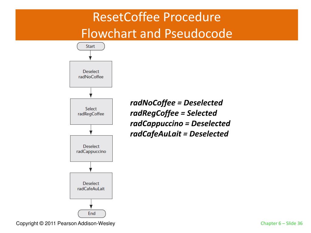 ResetCoffee ProcedureFlowchart and Pseudocode radNoCoffee = Deselected radRegCoffee = Selected radCappuccino = Deselected radCafeAuLait = Deselected