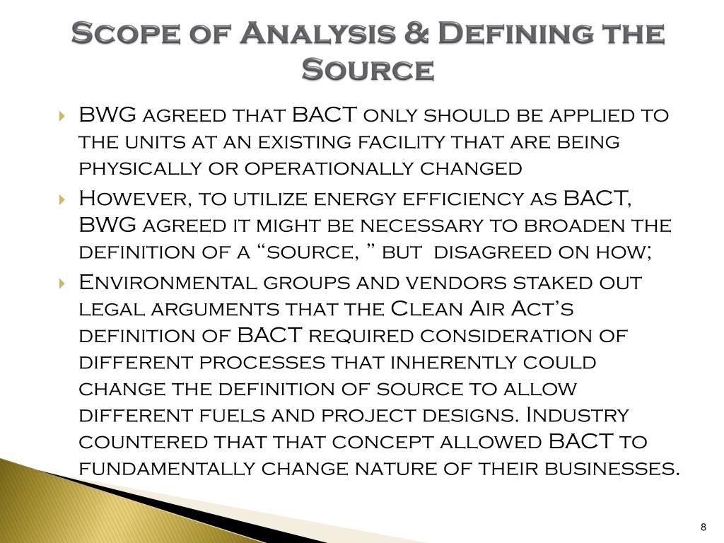 Scope of Analysis & Defining the Source • BWG agreed that BACT only should be applied to the units at an existing facility that are being physically or operationally changed • However, to utilize energy efficiency as BACT, BWG agreed it might be necessary to broaden the definition of a “source, ” but disagreed on how; • Environmental groups and vendors staked out legal arguments that the Clean Air Act’s definition of BACT required consideration of different processes that inherently could change the definition of source to allow different fuels and project designs. Industry countered that that concept allowed BACT to fundamentally change nature of their businesses.