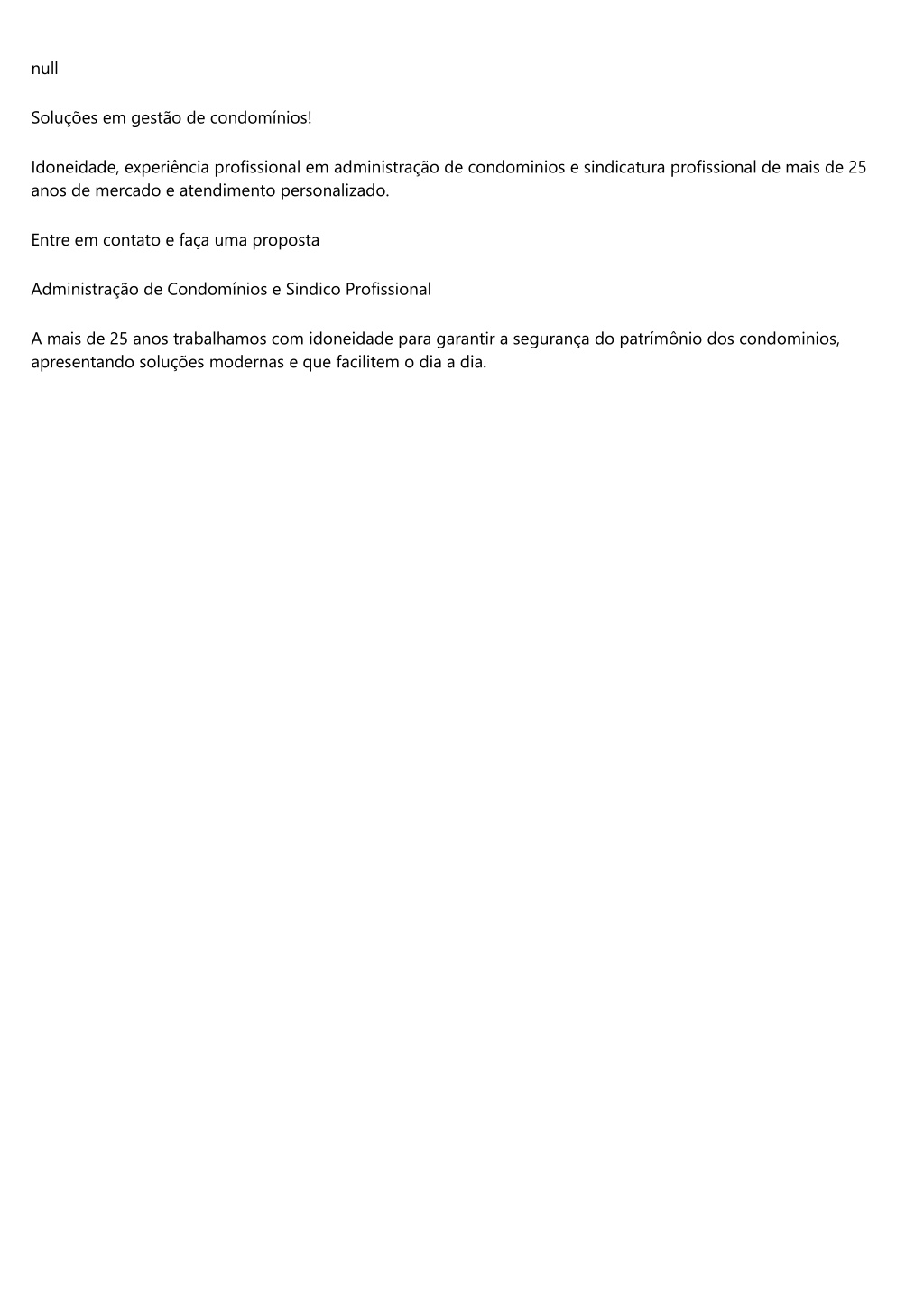 null Soluções em gestão de condomínios! Idoneidade, experiência profissional em administração de condominios e sindicatura profissional de mais de 25 anos de mercado e atendimento personalizado. Entre em contato e faça uma proposta Administração de Condomínios e Sindico Profissional A mais de 25 anos trabalhamos com idoneidade para garantir a segurança do patrímônio dos condominios, apresentando soluções modernas e que facilitem o dia a dia.