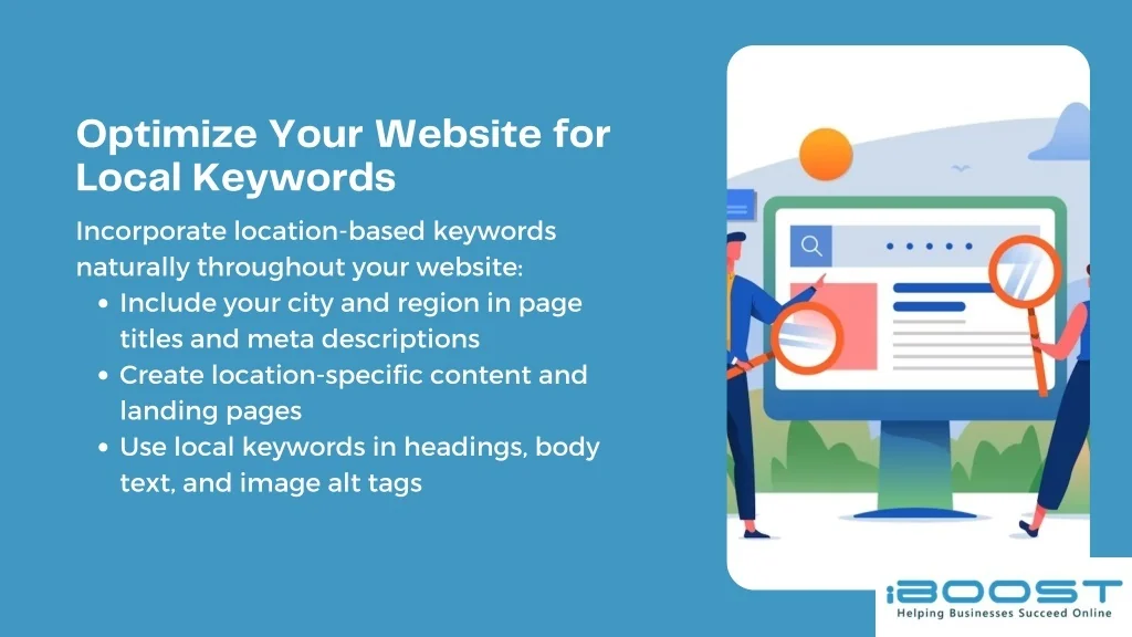Optimize Your Website for Local Keywords Incorporate location-based keywords naturally throughout your website: Include your city and region in page titles and meta descriptions Create location-specific content and landing pages Use local keywords in headings, body text, and image alt tags