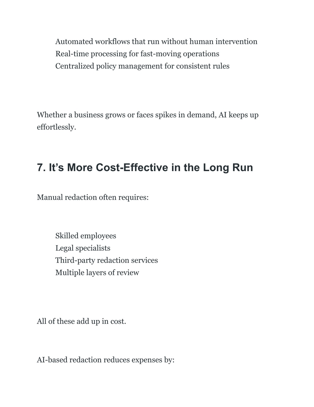 Automated workflows that run without human intervention Real-time processing for fast-moving operations Centralized policy management for consistent rules Whether a business grows or faces spikes in demand, AI keeps up effortlessly. 7. It’s More Cost-Effective in the Long Run Manual redaction often requires: Skilled employees Legal specialists Third-party redaction services Multiple layers of review All of these add up in cost. AI-based redaction reduces expenses by: