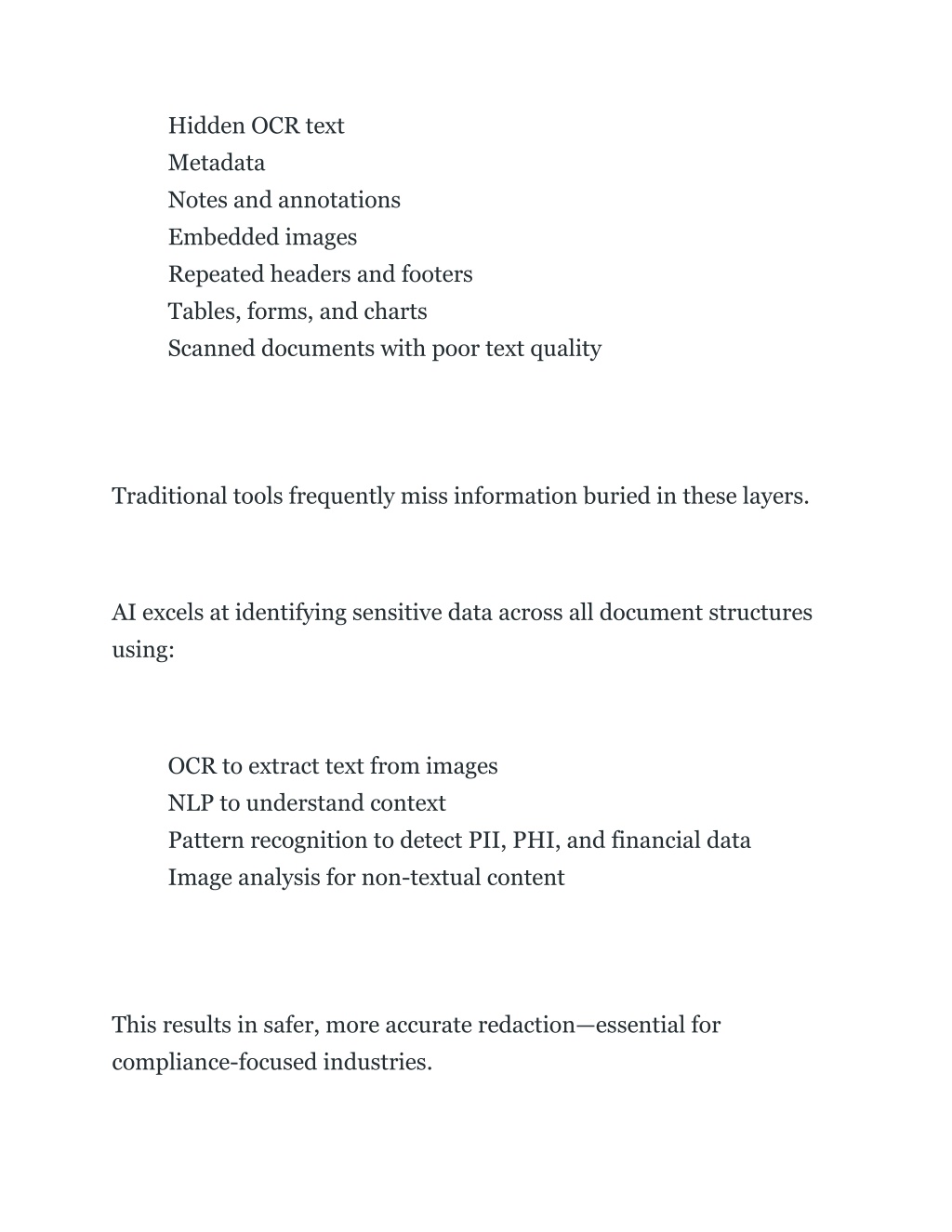 Hidden OCR text Metadata Notes and annotations Embedded images Repeated headers and footers Tables, forms, and charts Scanned documents with poor text quality Traditional tools frequently miss information buried in these layers. AI excels at identifying sensitive data across all document structures using: OCR to extract text from images NLP to understand context Pattern recognition to detect PII, PHI, and financial data Image analysis for non-textual content This results in safer, more accurate redaction—essential for compliance-focused industries.