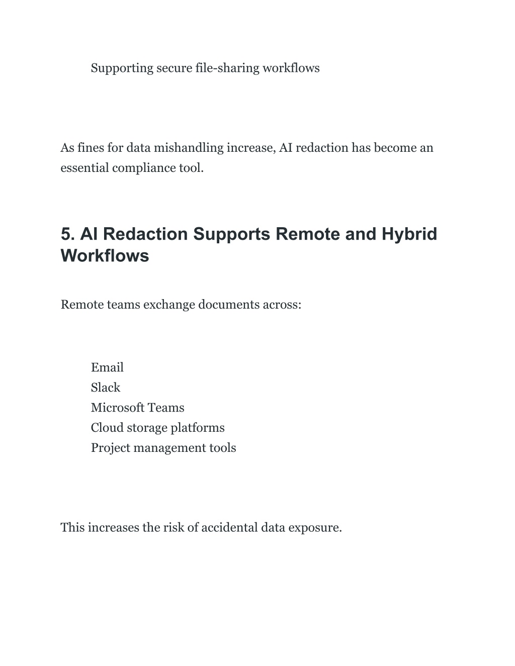 Supporting secure file-sharing workflows As fines for data mishandling increase, AI redaction has become an essential compliance tool. 5. AI Redaction Supports Remote and Hybrid Workflows Remote teams exchange documents across: Email Slack Microsoft Teams Cloud storage platforms Project management tools This increases the risk of accidental data exposure.