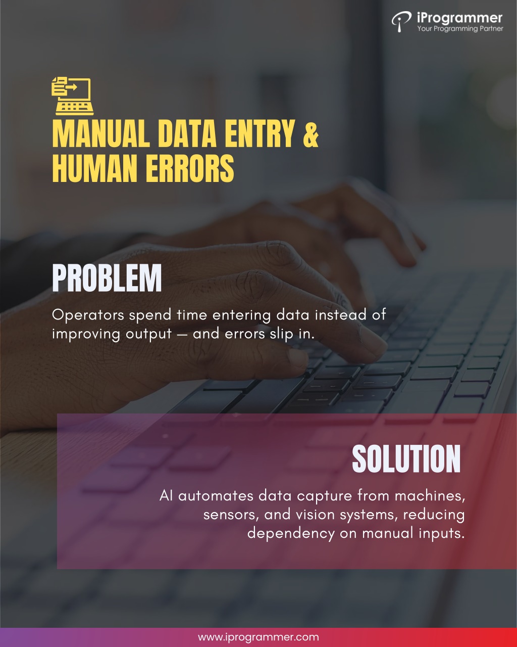 MANUAL DATA ENTRY & HUMAN ERRORS PROBLEM Operators spend time entering data instead of improving output — and errors slip in. SOLUTION AI automates data capture from machines, sensors, and vision systems, reducing dependency on manual inputs. www.iprogrammer.com