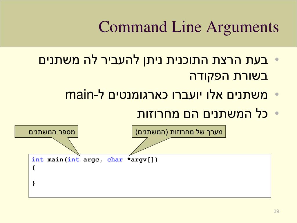 Command Line Arguments מספר המשתנים מערך של מחרוזות (המשתנים) intmain(intargc, char *argv[]) { } בעת הרצת התוכנית ניתן להעביר לה משתנים בשורת הפקודה משתנים אלו יועברו כארגומנטים ל-main כל המשתנים הם מחרוזות