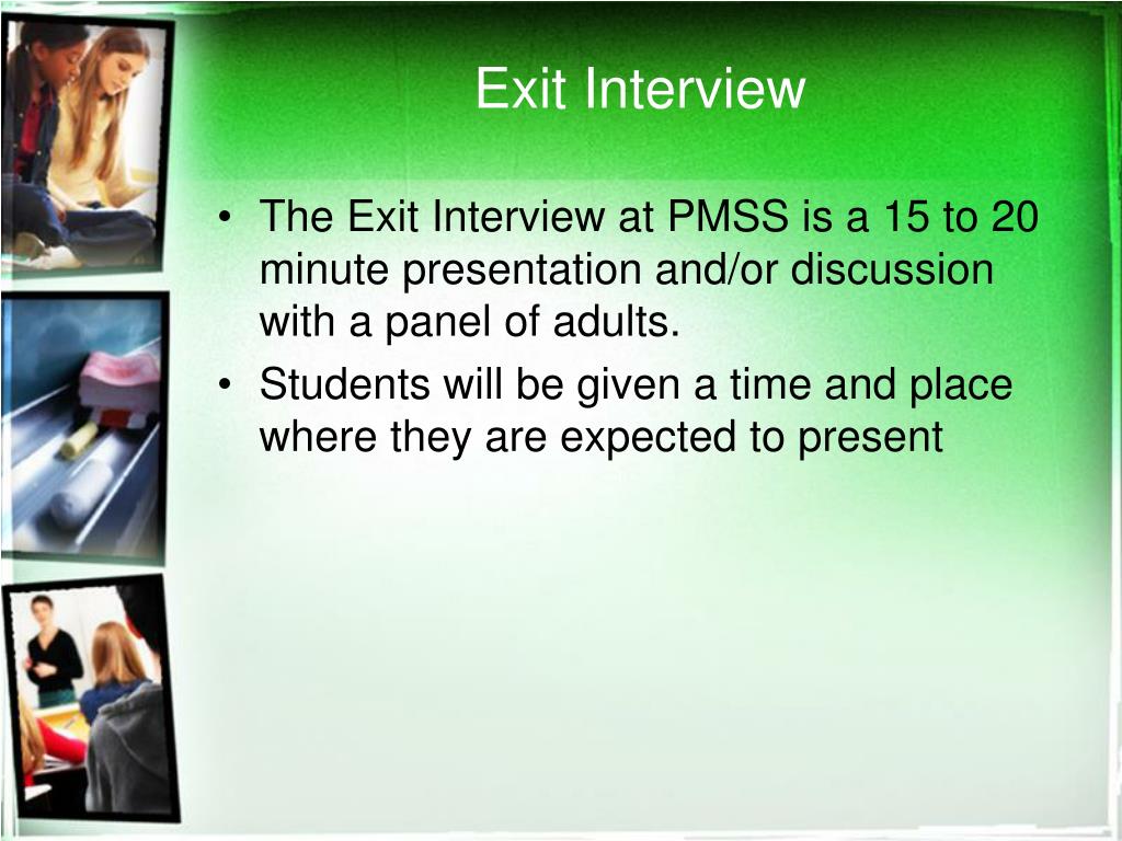 Exit Interview • The Exit Interview at PMSS is a 15 to 20 minute presentation and/or discussion with a panel of adults. • Students will be given a time and place where they are expected to present