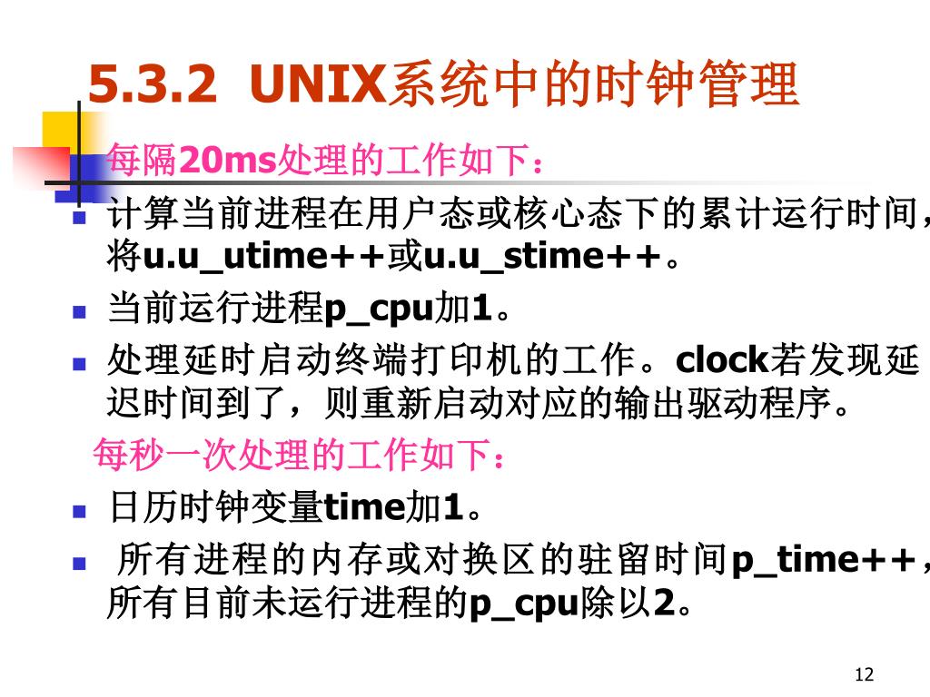 5.3.2 UNIX系统中的时钟管理 每隔20ms处理的工作如下: • 计算当前进程在用户态或核心态下的累计运行时间,将u.u_utime++或u.u_stime++。 • 当前运行进程p_cpu加1。 • 处理延时启动终端打印机的工作。clock若发现延迟时间到了,则重新启动对应的输出驱动程序。 每秒一次处理的工作如下: • 日历时钟变量time加1。 • 所有进程的内存或对换区的驻留时间p_time++, 所有目前未运行进程的p_cpu除以2。