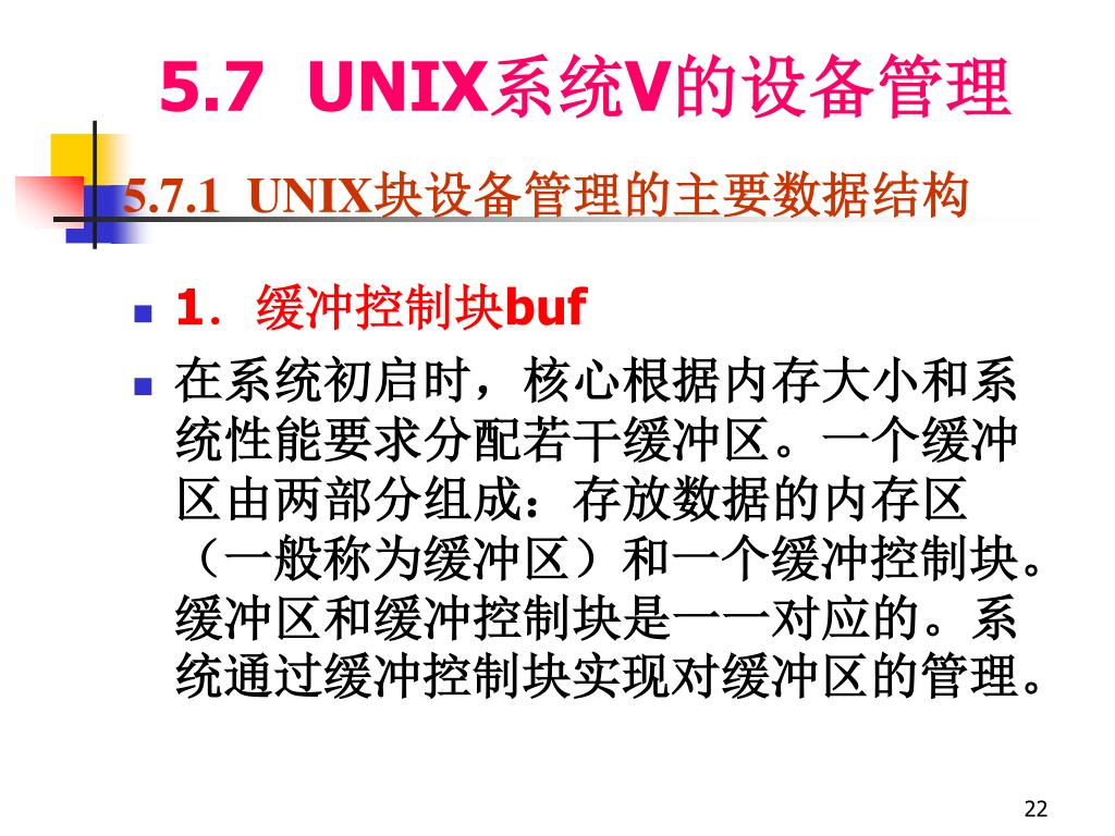 5.7 UNIX系统V的设备管理 5.7.1 UNIX块设备管理的主要数据结构 • 1.缓冲控制块buf • 在系统初启时,核心根据内存大小和系统性能要求分配若干缓冲区。一个缓冲区由两部分组成:存放数据的内存区(一般称为缓冲区)和一个缓冲控制块。缓冲区和缓冲控制块是一一对应的。系统通过缓冲控制块实现对缓冲区的管理。